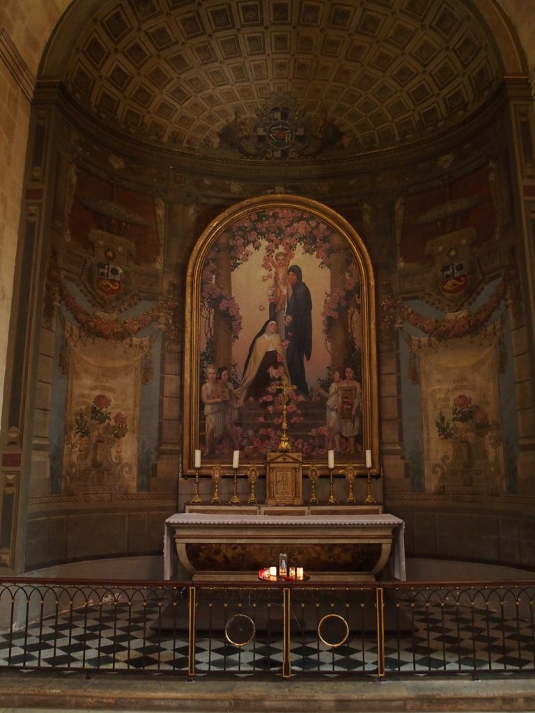 [4] Manchmal gelang bzw. gelingt dies aber auch recht einfühlsam bis in die Gegenwart, vorwiegend im Feld der Schöpfung neuer Kirchenfenster, sei es abstrakt, sei es gegenständlich. Ein Sonderfall ist die Kirche Notre-Dame in Bordeaux, die in einem Stil zwischen 1686 und 1707 gebaut und ausgestattet wurde. Ein Teil der Seitenkapellen ist Heiligen wie Katharina von Siena oder Sainte-Thérèse de l’Enfant-Jesus (= Thérèse Martin, 1873-1897, mit 15 trat sie in den Karmelitinnenorden ein) gewidmet. Das Bild dieser Theresa wurde 1927/28 vom Maler Roganeau aus dem Bordelais gemalt. Das weitere Dekor der Kapelle nimmt auf Santa Rosa von Lima (Peru) Bezug, der die Kapelle früher geweiht gewesen war. Eine weitere überseeische Verbindung wird durch die Kapelle Notre-Dame de Guadeloupe hergestellt, deren Bild vom Maler Martineau stammt. Er starb 1868 in Bordeaux, das Bild wird etwas pauschal auf „Second Empire“ datiert.